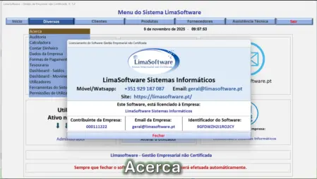 Ecrã Acerca do LimaSoftware – Informações e Licenciamento do Sistema
